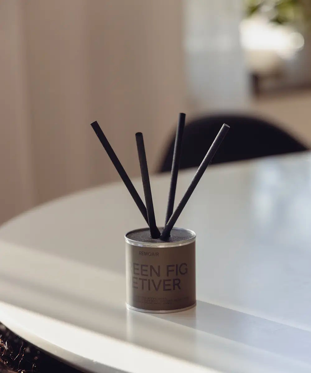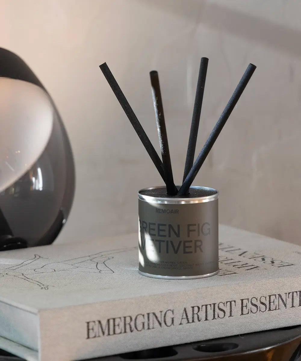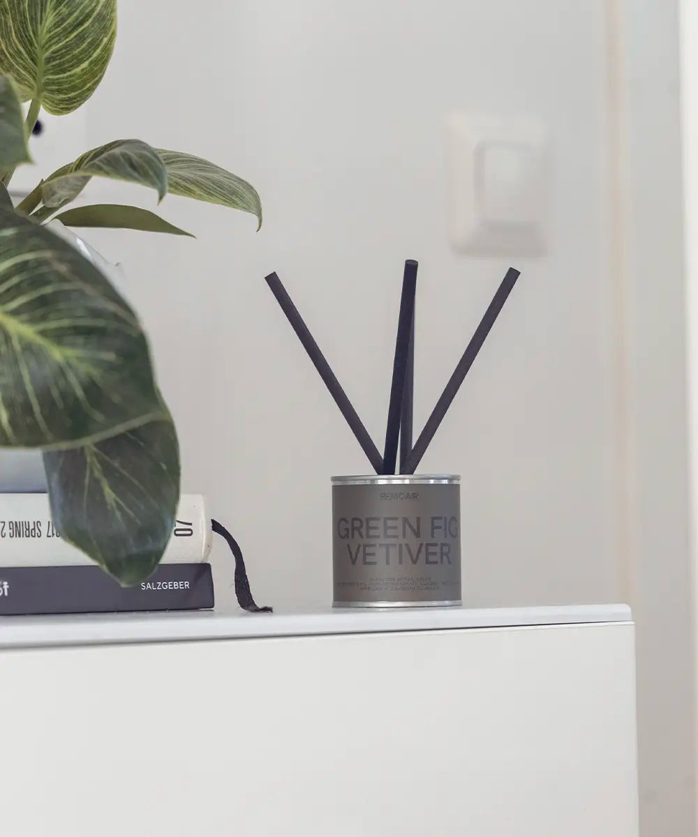 Stilrena miljövänliga doftpinnar med en grå beige etikett står på en trave böcker i ett skandinaviskt vardagsrum.